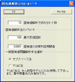 メニューより、[動的解析用データ]−[固有値解析コントロールデータ]を選択すると「固有値解析コントロールデータ」ダイアログが表示される。